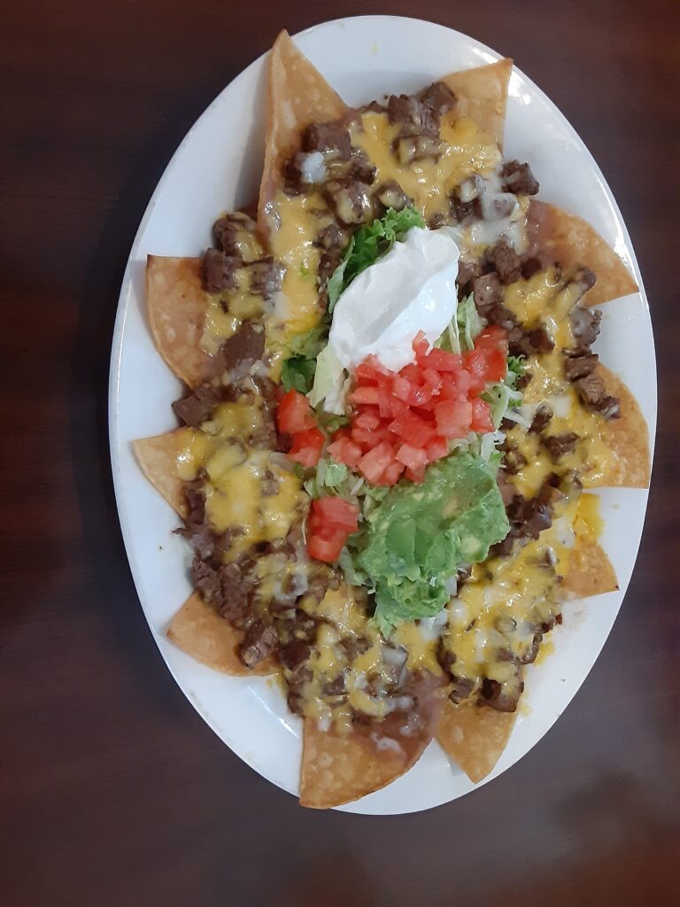 Nachos Fresa With beans, cheese, letttuce, tomatoes, and jalapeños.