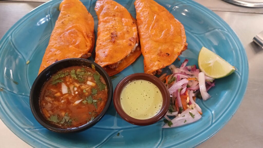 Chalupas Ground beef chalupas with cheese, lettuce, tomato, avocado and cream.